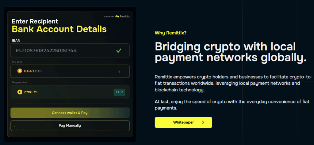 Remittix is going after the remittance market directly. The platform lets users fund transfers in crypto and deliver fiat into bank accounts across 30 currencies, using local networks for same-day settlement.