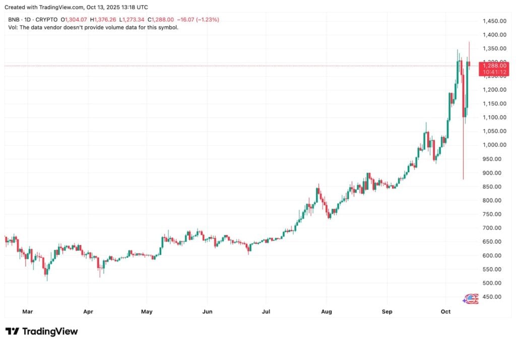As of October 2025, BNB continues to show strong performance despite some short-term price swings. It is currently trading at $1286 per BNB/USD, and so far, it has seen a massive increase of about 87% in the last 3 months, and it even recorded a 13% daily jump after Binance’s new Aster DEX surpassed Solana in transaction fees. This growth reflects both increased demand and solid fundamentals within the Binance ecosystem.