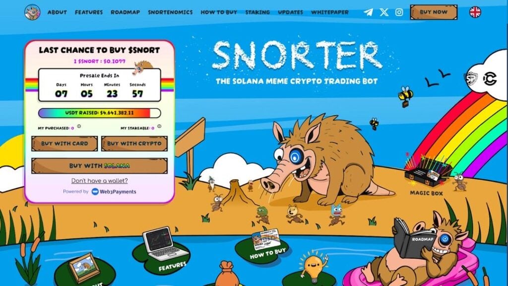 Snorter ($SNORT) is a popular meme coin built on the Solana blockchain that stands out for its real utility through a powerful Telegram trading bot. The project uses fun branding with an aardvark mascot while focusing on providing traders with fast and secure automated trading tools.