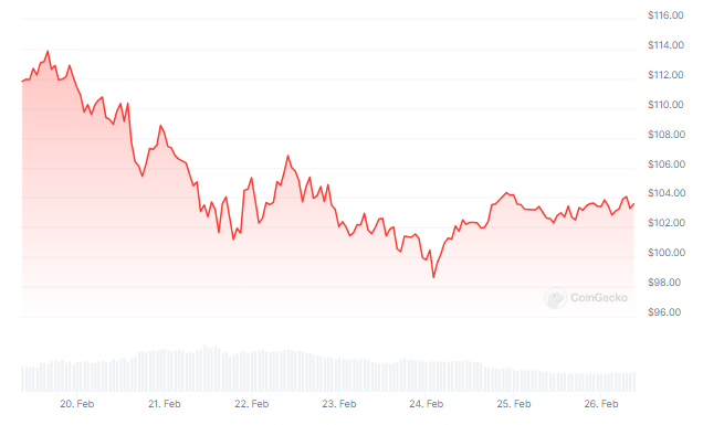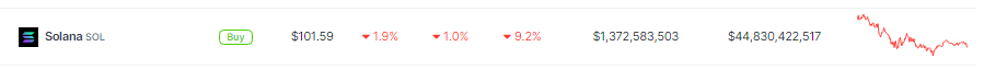 At the time of writing, SOL was trading at $101.59 down .0% and 9.2% in the 24-hour and weekly timeframes, data from Coingecko shows.