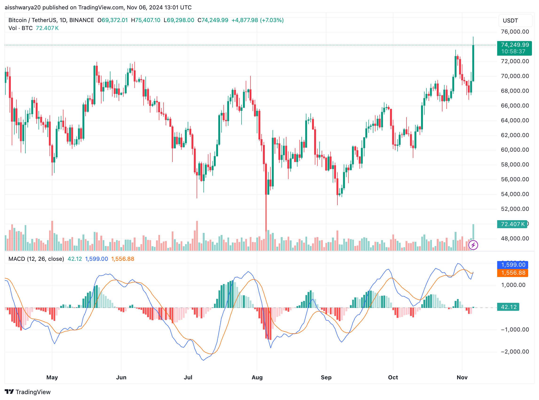 At press time, BTC is trading at $74,249, up 8% in the last 24 hours.