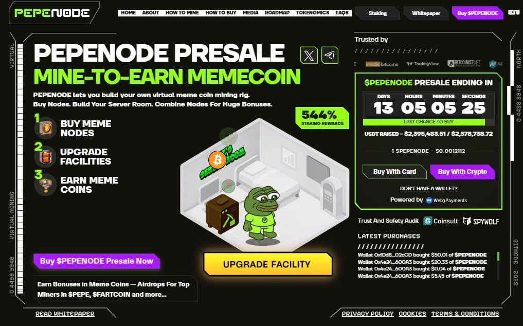 Pepenode is a meme coin project that combines the excitement of crypto with interactive utility, allowing participants to build virtual mining rigs and earn rewards. The platform has already raised nearly $2.4 million, with only 13 days left for investors to join the presale.