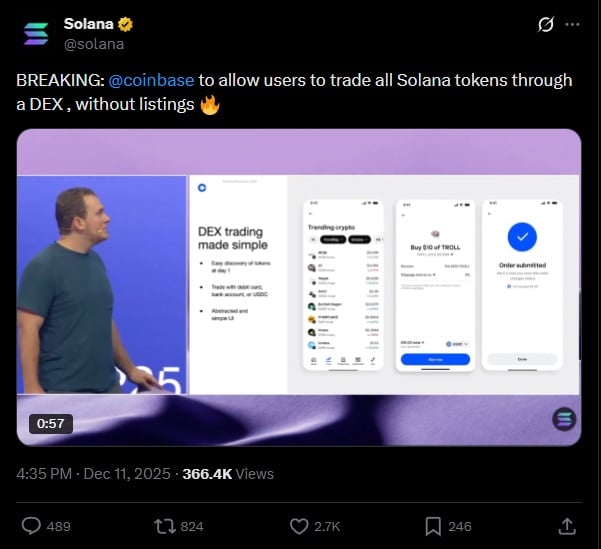 Coinbase has significantly expanded its support for Solana by integrating native DEX trading directly into its app. This update allows the platform’s 100 million users to trade any Solana-based token instantly, without waiting for formal listings.