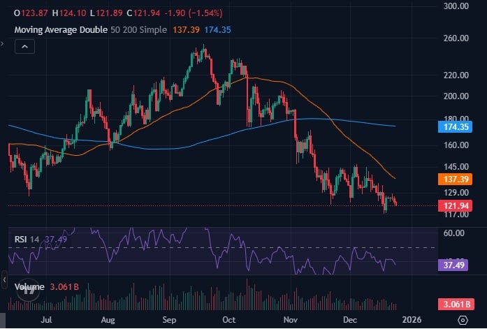 This potential dip is viewed as a technical test rather than a breakdown, as broader structure remains intact. If price reacts strongly around $120, a rebound back above $124 could restore short-term stability.