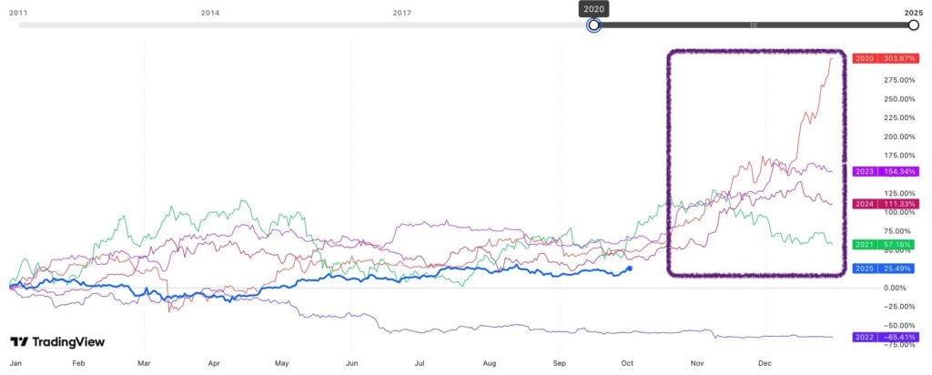 Q4 has always carried weight in crypto’s story. Past cycles have seen some of the most dramatic runs occur in these final months of the year, where Bitcoin sets the momentum and altcoins amplify it with outsized gains.