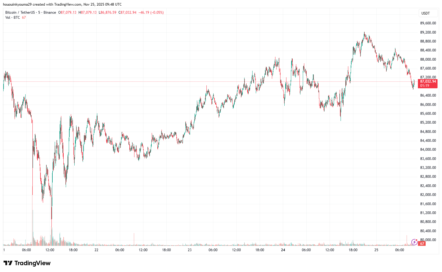 Bitcoin ha mostrato un breve rimbalzo sopra gli 89.000 dollari lunedì, ma in seguito è tornato a ritracciare fino a quota 87.000 $.