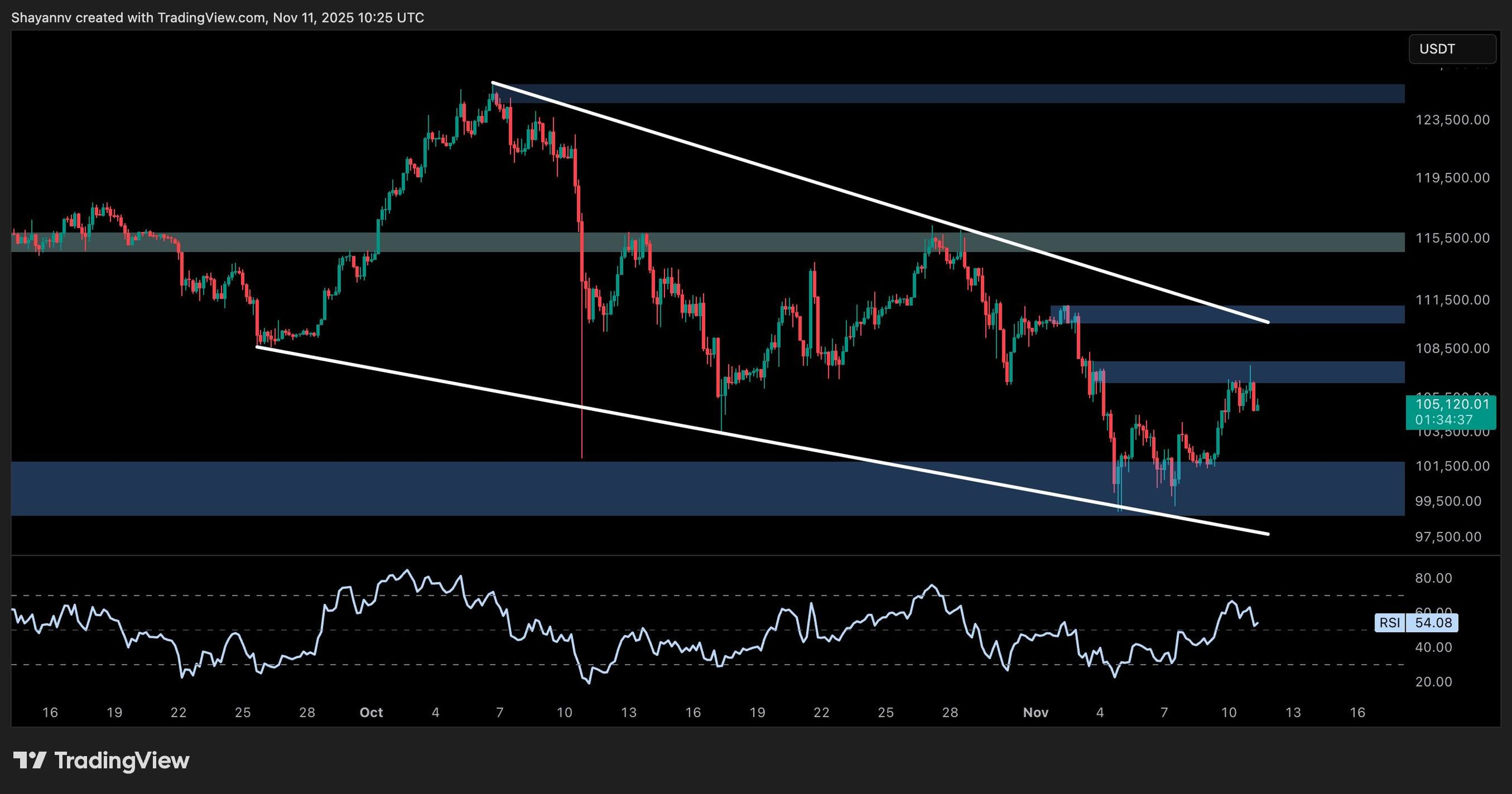 The RSI has also cooled off slightly after reaching near-overbought levels, showing signs of consolidation. A clean breakout above the wedge and a strong close above $110K would signal potential continuation. But if this zone rejects price again, another visit to the $100K level would be expected.
