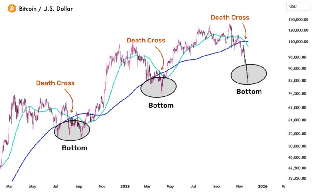 A Bitcoin death cross is a technical trading pattern that occurs when a Bitcoin’s 50-day Small Moving Average (SMA) crosses below the long-term 200-day moving average. The move signals a potential shift from a bullish setup to a bearish setup. Such a death cross was observed on the BTC chart in November, and the index immediately breached the $100k price level and struggled to find a floor.