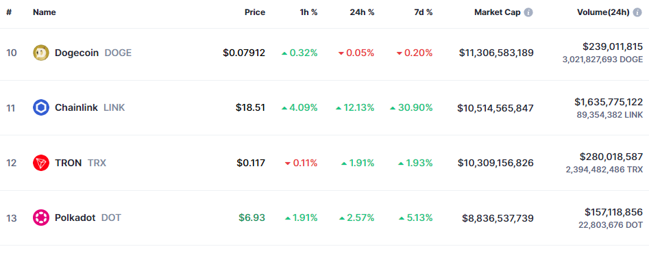 Dogecoin (DOGE) is the next coin above Chainlink now, and if the asset can continue its run, it should be able to flip the meme coin. While there is still some gap between their market caps, it isn’t too big.