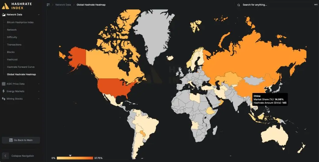 Publicly available maps track hashrate by country, but exact figures can shift fast. The best current snapshot points to China at 14% and about 145 EH/s of capacity, but those numbers will change as miners add or remove machines.