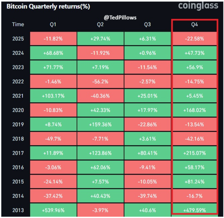 Bitcoin Quarterly Returns. Source: @TedPillows On X
