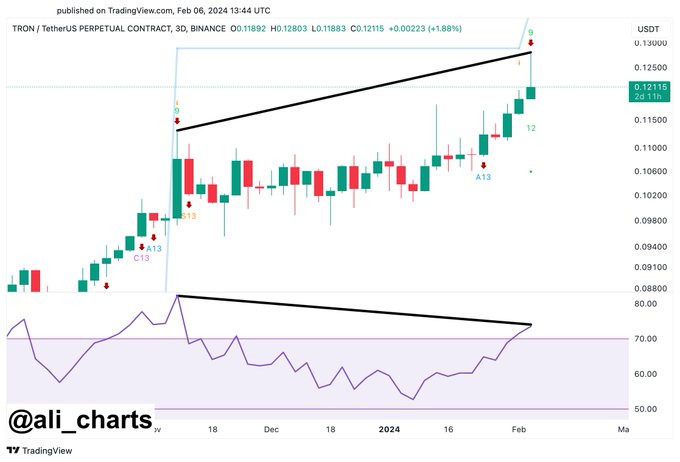 This bearish outlook is reinforced by a divergence between the TRON price and the Relative Strength Index (RSI), suggesting weakening momentum and potential downward movement in the near term.”