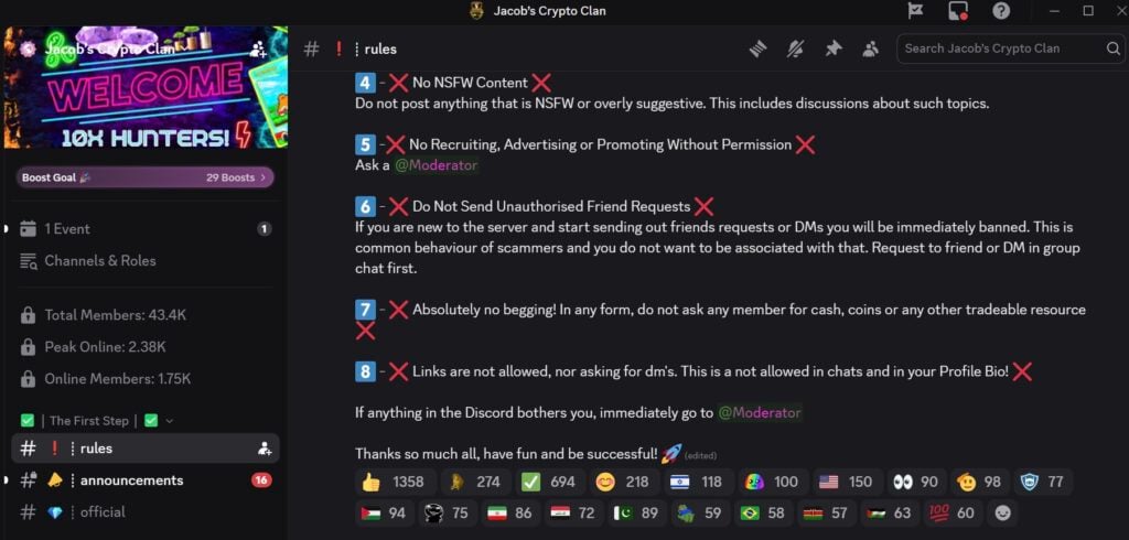 Among them is Jacob’s Crypto Clan – a top-tier crypto Discord server filled with over 43k members and multiple hands-on technical analysts actively sharing high-quality trading signals, ideas, and insights for profitable trades.