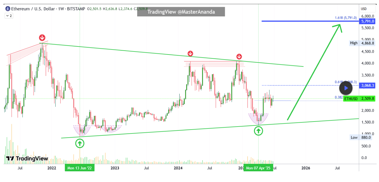 MasterAnanda’s weekly candlestick chart shows a large ETH wedge pattern with consistently rising lows from June 2022 to April 2025. On the other hand, price highs have been relatively flat, specifically around the March and December 2024 peaks. Ethereum’s behavior since April has been marked by low volatility and sideways movement, which often precedes large market moves. The most interesting move was when its price dropped to as low as $1,470 on April 9 before quickly rebounding and establishing a rounded bottom formation.