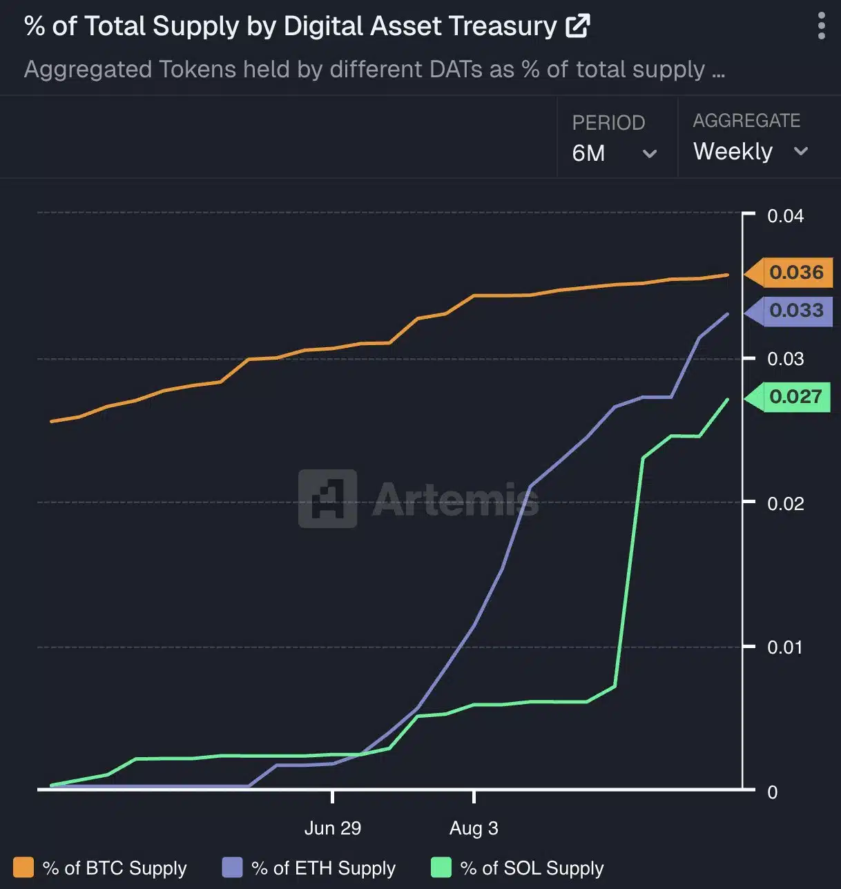 Data from Artemis confirmed steady increases in Digital Asset Treasuries (DATs). As of August, ETH’s share stood at 0.033% of total supply, while SOL reached 0.027%.