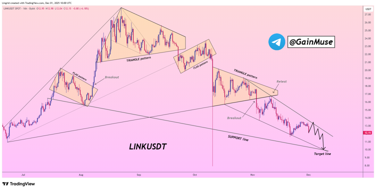 Market analyst GainMuse notes that Chainlink faces persistent bearish pressure, with sellers defending every attempt at lower highs. After failing to sustain a recent bounce, LINK continues drifting within its descending channel, highlighting cautious market sentiment and the hurdles ahead for a meaningful recovery.