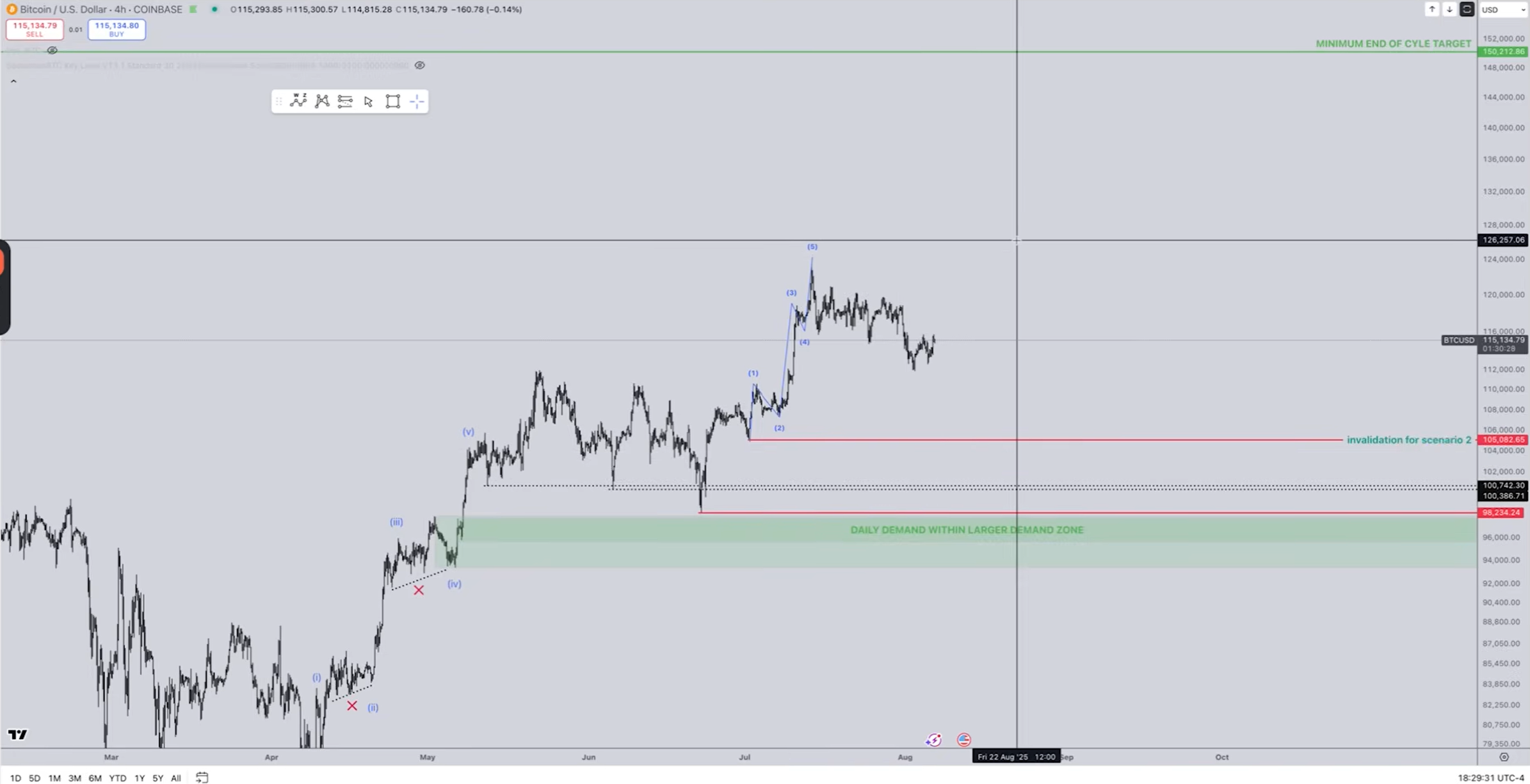 The implication is arithmetic as much as it is structural: if wave one spanned approximately $20,000 top to bottom, a standard third wave would be larger, pushing toward at least the mid-$130,000s before a fourth-wave pause and a terminal fifth carry the move into the $150,000-plus region. This is why he characterizes $107,000–110,000 as “the best R:R for longs,” the last high-probability staging area for a reversal before invalidation.