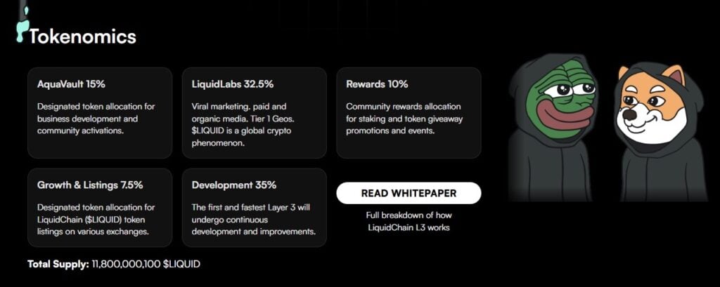 Another 32.5% flows into LiquidLabs, the marketing and viral growth engine built to accelerate awareness across Tier-1 geographies and major media channels. This segment represents a coordinated push toward global visibility, which is essential for any altcoin to buy during its early formation phase.