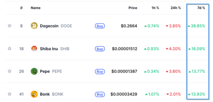 Memecoin trading volume is up by 14% in the last day, and many in the top 10 are showing ample upside in the last week.