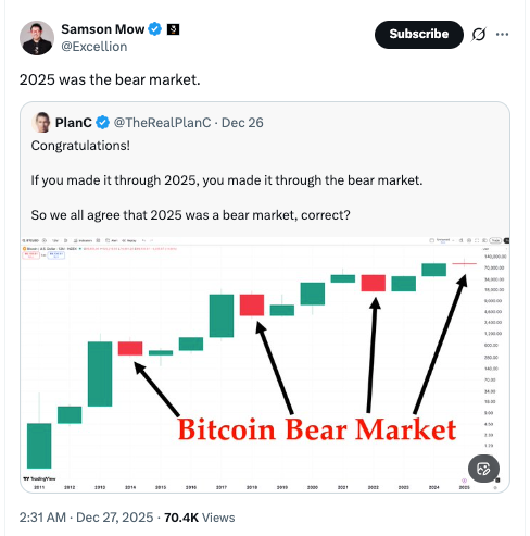Bitcoin maximalist and CEO of JAN3, Samson Mow, recently said that 2025 was a bearish year and that a major 10-year bull market is now expected to begin. Even though Bitcoin recorded a new All-Time High (ATH) of $126k just a few months ago, the overall market sentiment for the outgoing calendar year has been negative, especially at close. Still, now there is an opening for a major long-term bull run, Mow argues.