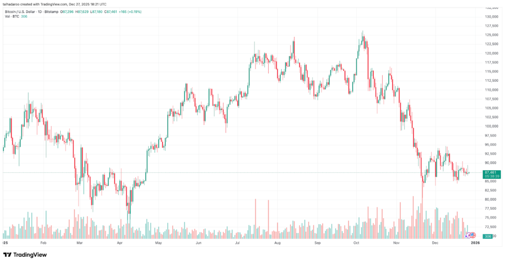 The graph shows that, based on Bitcoin’s yearly market activity, the premier cryptocurrency is ending the calendar year slightly below its starting point above $93k on January 1. While the net loss is less than 8% based on the latest price index of $87.5k, we still have a few more days until year-end. The current trend is suggesting a largely muted end to the proceedings, and these losses are likely to hold.