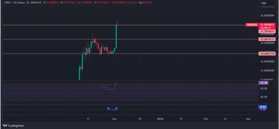 ORDIUSD currently trading at $32.51 territory on the daily chart: TradingView.com