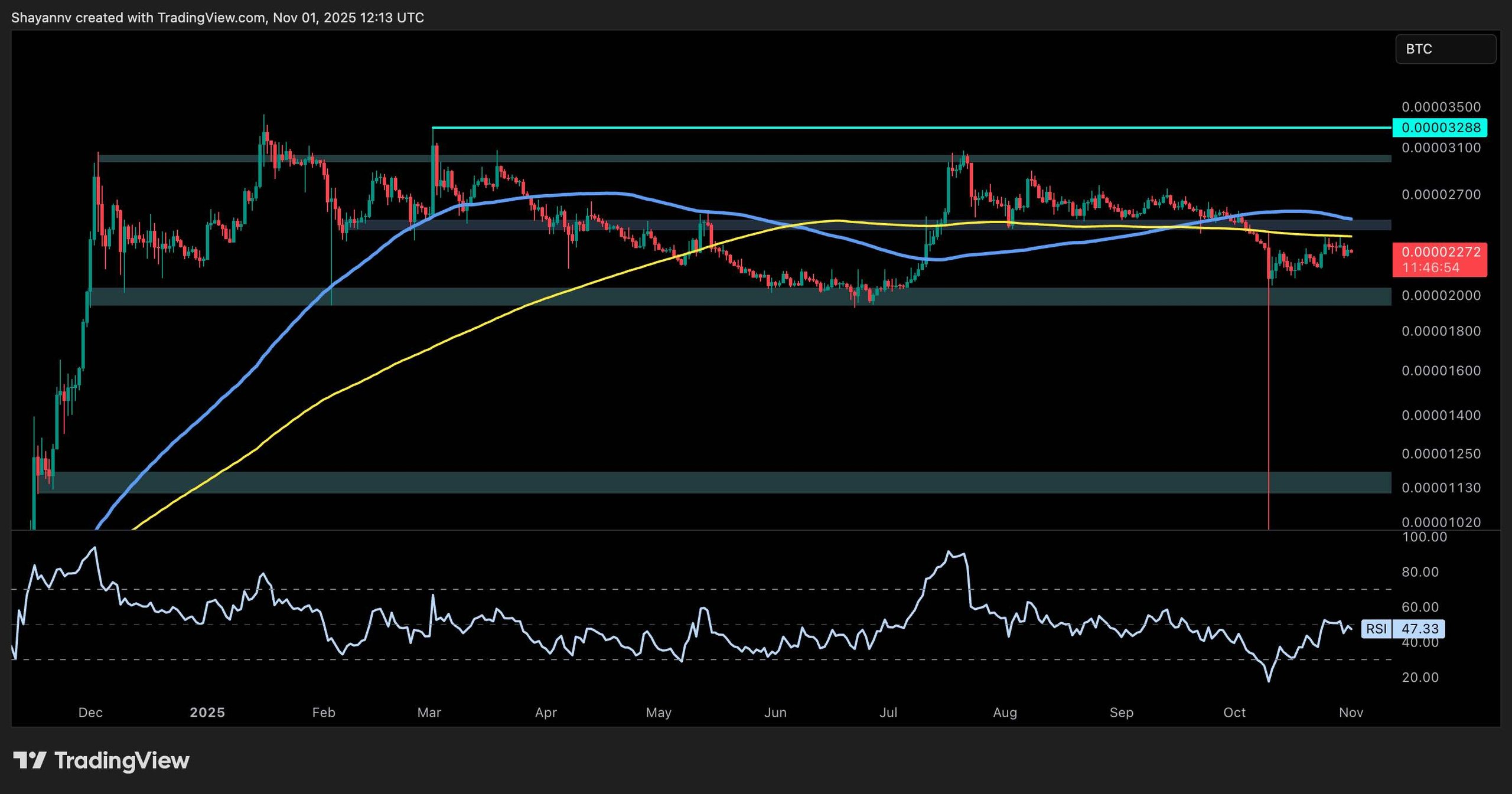 While the bounce off the 2,000 sat zone shows buyers are still defending key long-term support, there’s little follow-through to suggest strength. The RSI at 47 indicates a neutral momentum, but unless a clean break above 2,500 sats with high volume occurs, XRP continues to lag against Bitcoin.