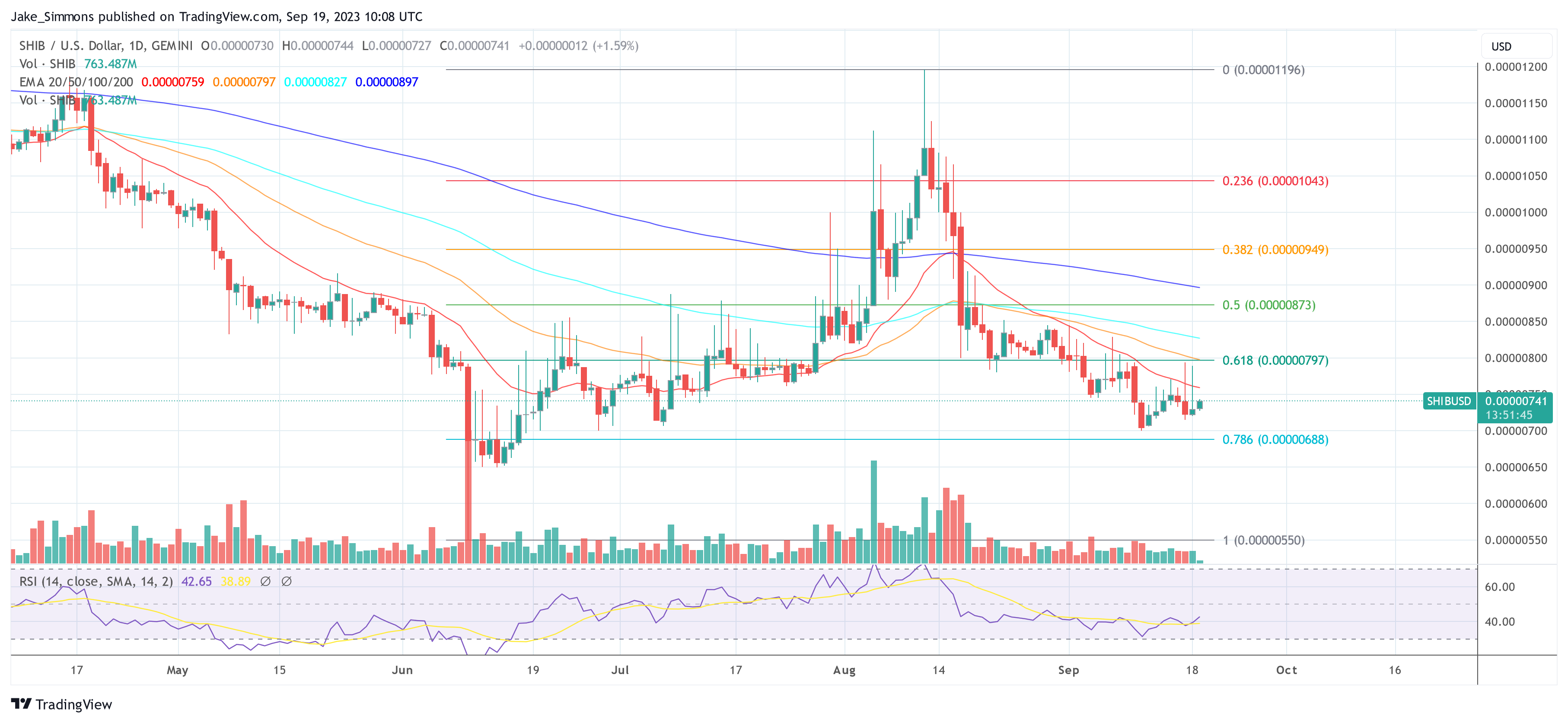 In the shorter timeframes, such as the 4-hour chart, we can see that the bulls cannot yet feel secure (yet). SHIB is currently stuck in the trading range between $0.00000688 (78.6% Fibonacci) and $0.00000797 (61.8% Fibonacci). After briefly falling into oversold territory (below 30) on September 11, the RSI has now risen to 42. However, this metric also shows that sentiment remains subdued.