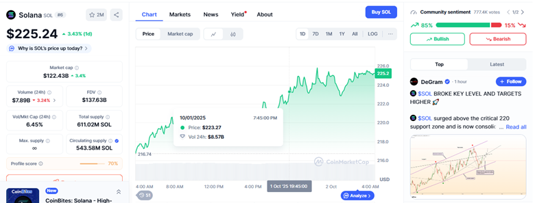 Solana has remained strong in 2025. At the time of writing, SOL trades around $225.24, with a market cap of $122.43B and a fully diluted value of $137.63B. Its daily volume is about $7.89B, with 543.58M tokens in circulation from a 611.02M total supply, giving a volume-to-market cap ratio of 6.45%. Over the past week, SOL rose more than 18%, showing rising confidence among traders.