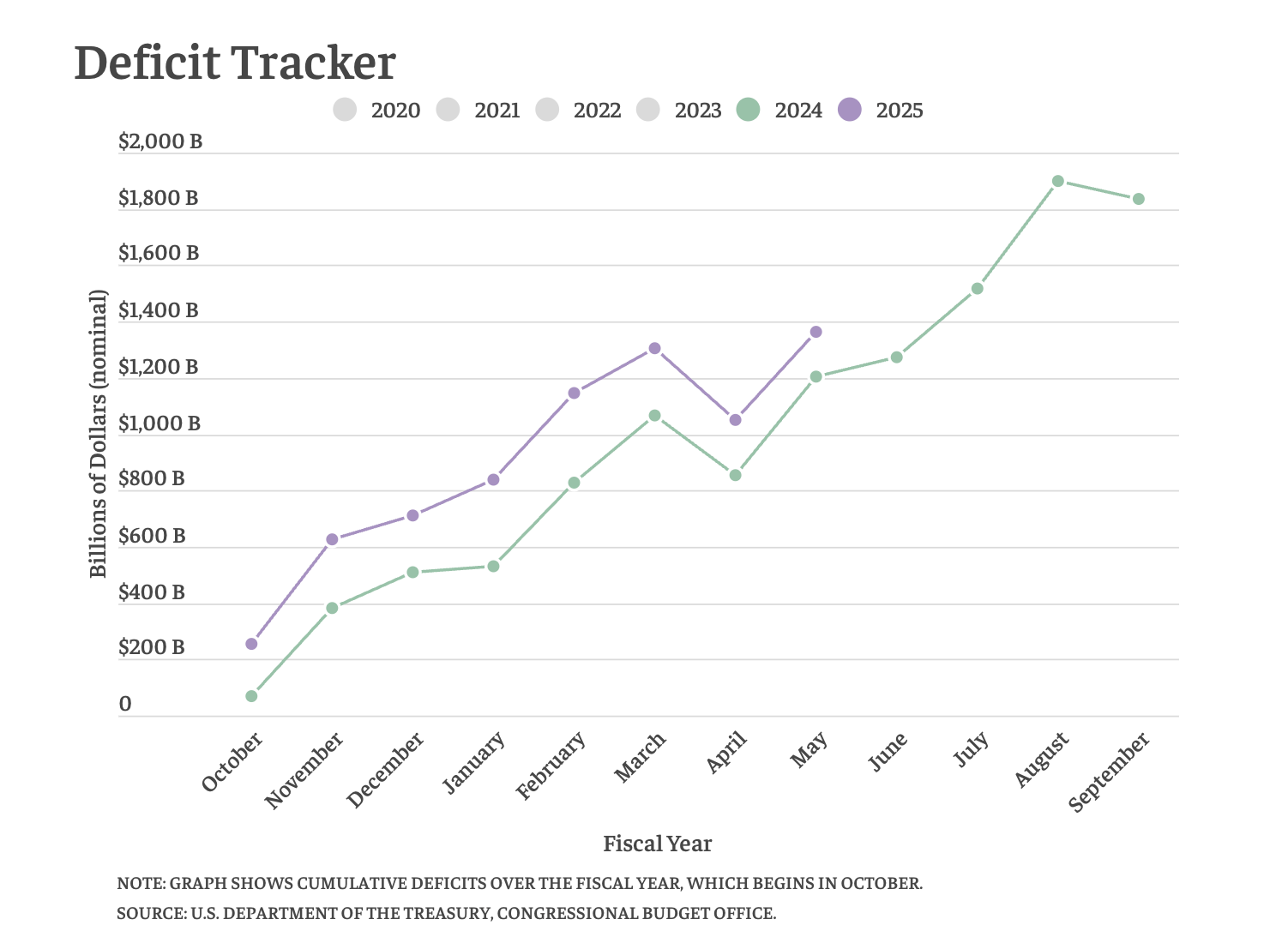 According to the Bipartisan Policy Center, the federal government’s fiscal deficit reached $1.1 trillion by April 2025, a 13% increase from last year.