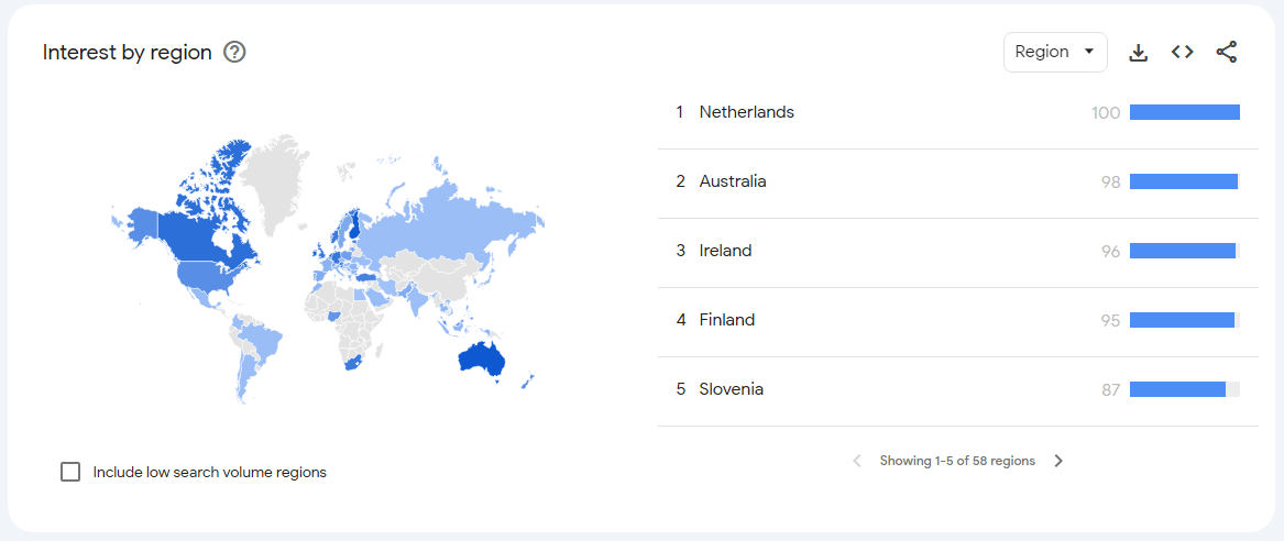Interest in XRP is a worldwide phenomena, not limited in any one area at once. According to the statistics, searches for XRP point the charge towards the Netherlands, Australia, Ireland, Finland, and Slovenia.