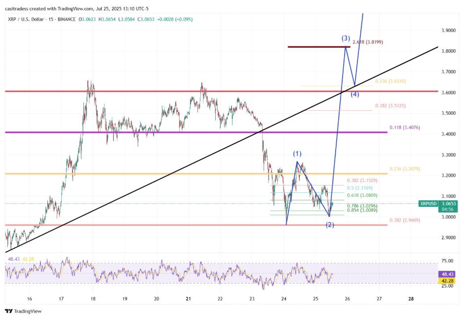 Crypto analyst CasiTrades also weighed in on the current technical setup by pointing to an Elliott Wave count that suggests a major third wave is about to begin. In her analysis posted on X, she confirmed that XRP has completed a subwave 2 correction, reaching the deep 0.854 Fibonacci retracement level before bouncing. What’s important here is that the price held above $3, never forming a new low, which is probably now a new price floor.