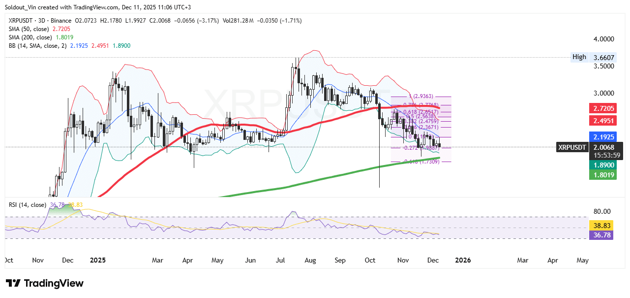 XRP has been in a steady downtrend since mid-November 2025 and is currently trading around $2.01. The price recently tested the 200-period SMA near $1.80, which acts as strong long-term support.